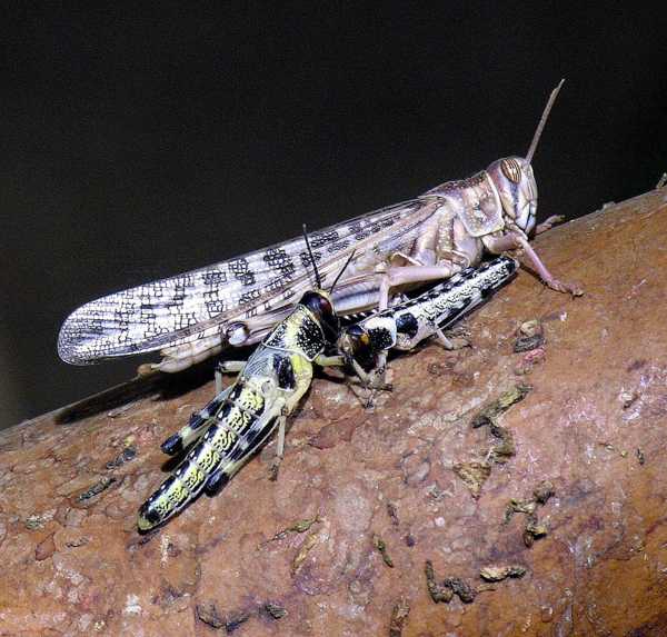 Un criquet du désert adulte à côté de deux nymphes. (Crédit photo : Dick Culbert de Gibsons, C.-B., Canada, CC BY 2.0, via Wikimedia Commons) Avantages évolutifs