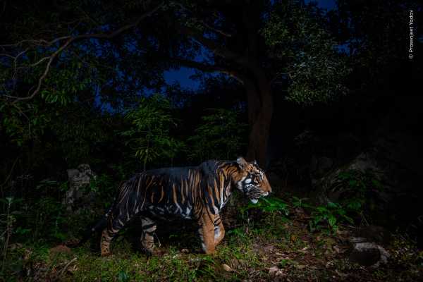 Prasenjeet Yadav’s “Dark Knight” features a seldom-seen tiger sporting thick, black stripes wandering through an Indian tiger reserve.(Image credit: Prasenjeet Yadav / Wildlife Photographer of the Year)