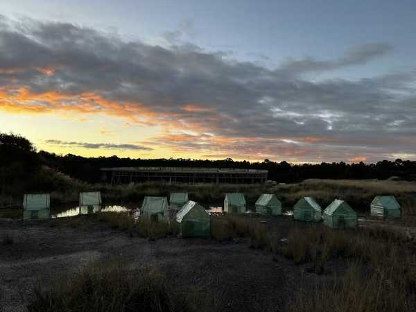 Finalmente, queríamos ver se isso poderia funcionar em um ambiente natural. Realizamos experimentos ao ar livre com 239 sapos. Metade foi infectada com quitrídeo uma semana antes do início do experimento. Em seguida, eles foram colocados em recintos com estruturas artificiais que aquecem ao sol, chamadas “saunas de sapo”. Mas os sapos podiam escolher entre áreas sombreadas e ensolaradas, com ou sem saunas.
