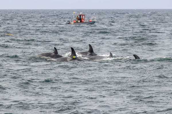 Researchers aboard the research vessel Steller Quest observe Northern Resident killer whales. (Image credit: University of British Columbia (A.Trites), Dalhousie University (S. Fortune), Hakai Institute (K. Holmes), Leibniz Institute for Zoo and Wildlife Research (X. Cheng))Scrounging for food?