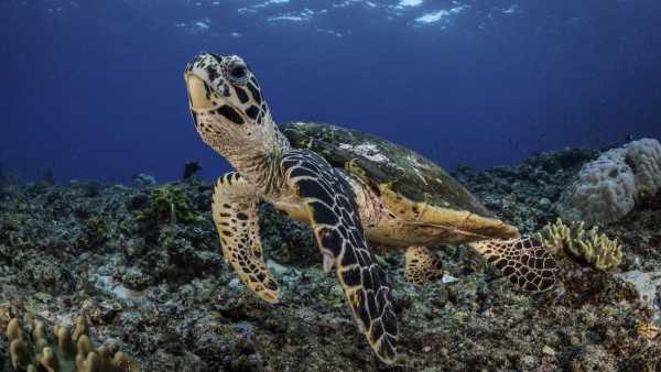 A hawksbill turtle (Eretmochelys imbricata) swims over the coral reef in Kimbe Bay, Papua New Guinea. Notice its flattened shell, which helps it more easily swim through the water than the domed shell of a tortoise would.