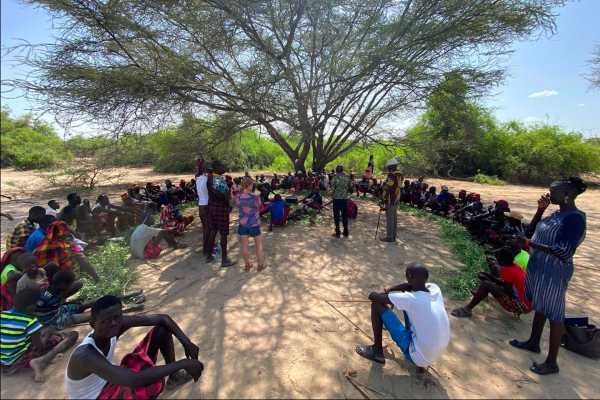 Study team personnel clarify the project objectives to a community proximal to Nakechichok on the Turkwel River within Turkana County, Kenya.