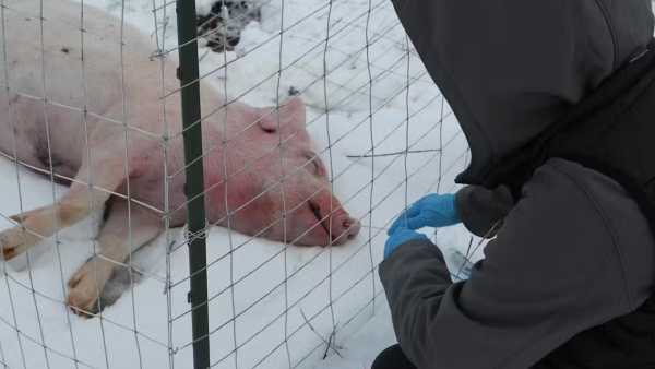 The analysts gather samples originating from within and atop the snouts of deceased pigs.