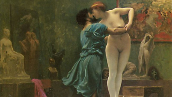 This story also appears in the paintings of the French artist Jean-Léon Gérôme (1824-1904). A sculptor is carving a marble statue, and a model stands before him.