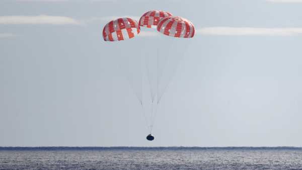 A 25.000 pies (7.600 m), dos “paracaídas de frenado” — cada uno de 23 pies (7 m) de diámetro — se desplegarán y reducirán la velocidad de la cápsula a unas 307 mph (494 km/h). Luego, a unos 9.500 pies (2.900 m), se desplegarán los tres paracaídas principales de la cápsula, de 116 pies (35 m) de ancho, reduciendo la velocidad de la cápsula a solo 17 mph (27 km/h) para un amerizaje seguro en algún lugar del Océano Pacífico, según la NASA.