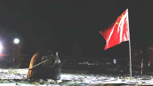 La cápsula de retorno Chang’e 5 en su lugar de aterrizaje en Mongolia Interior, China, el 17 de diciembre de 2020. China se convirtió en el primer estado en devolver muestras de roca del lado lejano de la Luna a través de su misión Chang’e-6 en 2024. (Crédito de la imagen: CASC)