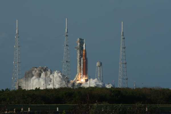 Una vista del cohete Artemis II al dejar la plataforma de lanzamiento. (Crédito de la imagen: Roger Guillemette)